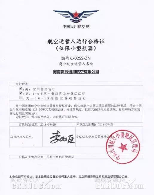 日前,河南貫辰通用航空有限公司順利通過民航局審查驗證,取得CCAR-135部小型航空器商業(yè)航空運營人運行合格證,正式具備了a類-空中游覽運行、b類-1~9座航空器載客及全貨運運行資質。